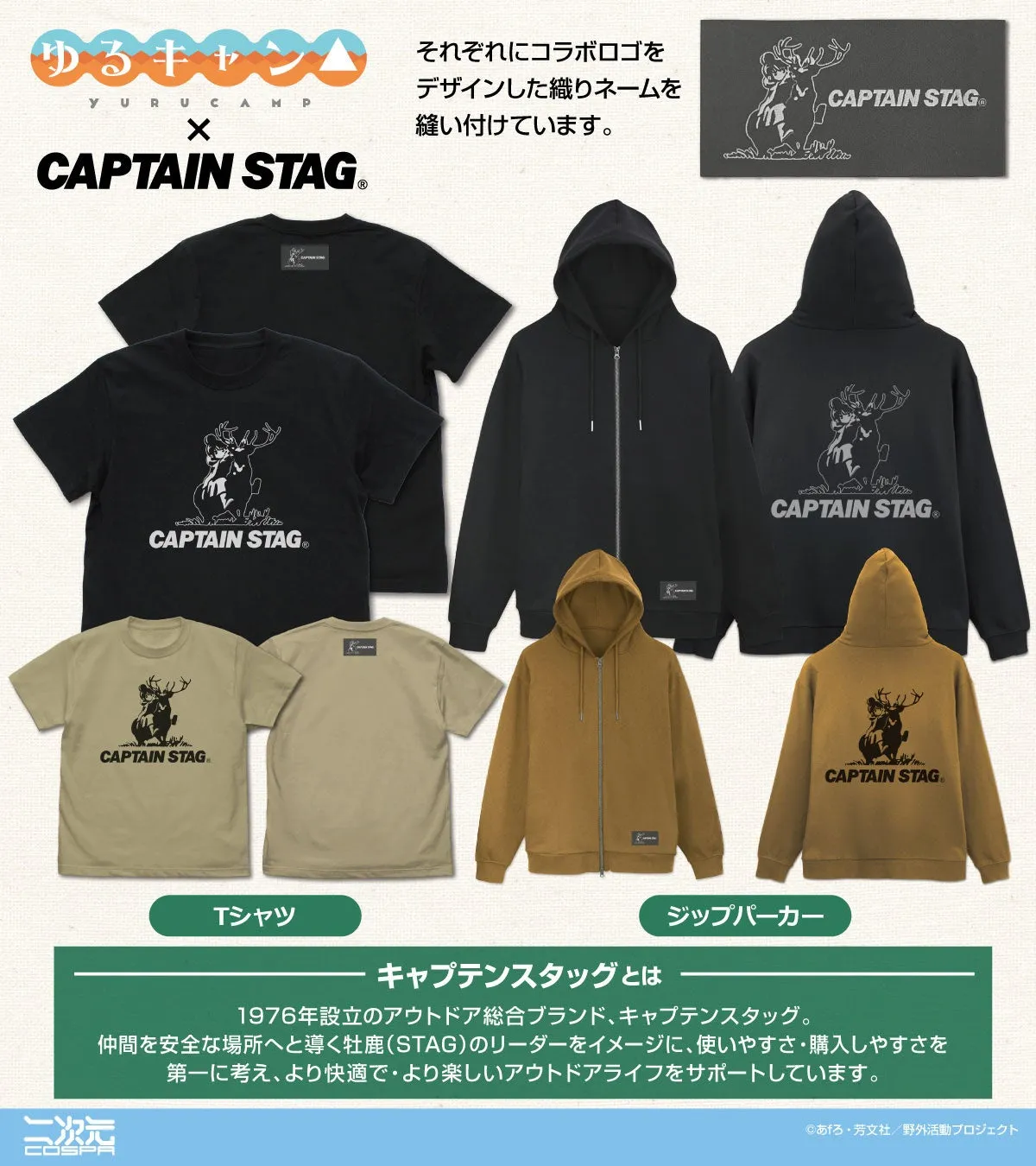 今回のコラボでは、特に注目を集めているのが「ジップパーカー」と「Tシャツ」です。デザインには、キャプテンスタッグのシンボルでもある「牡鹿」と、アニメの人気キャラクター「志摩リン」が組み合わさった特別なロゴが使われています。寒い季節のアウトドア活動にもぴったりのアイテムです。