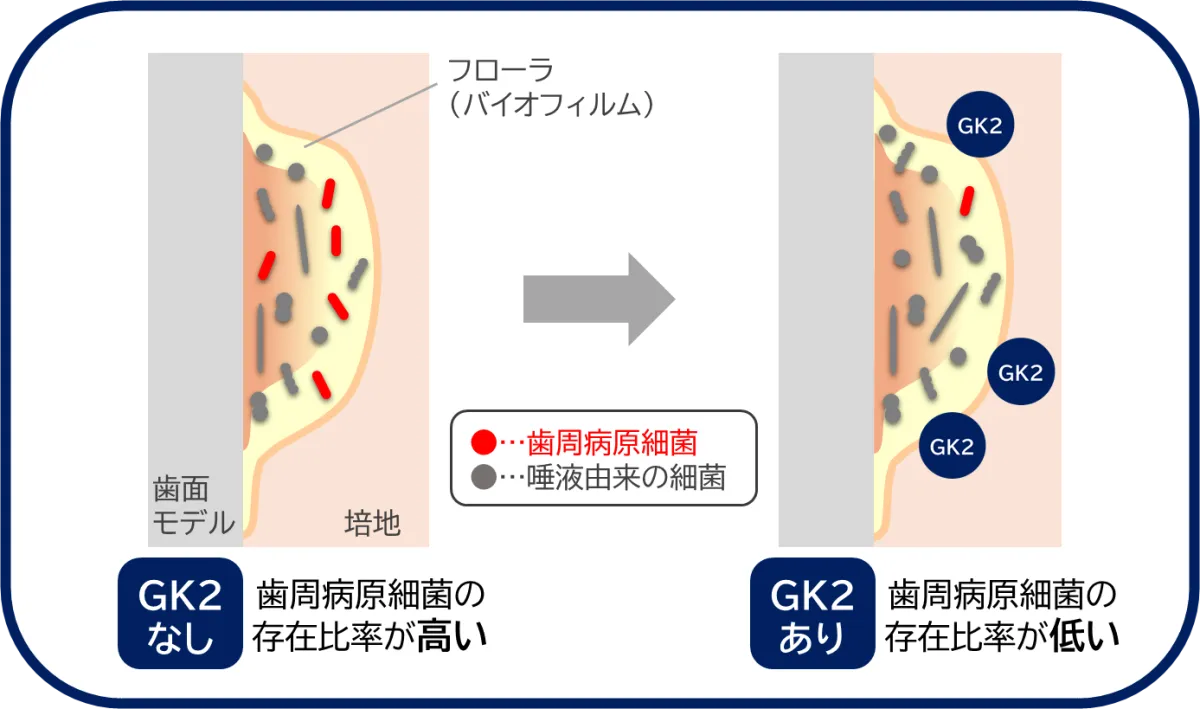 この実験により、GK2が口内の歯周病原細菌の増殖を顕著に抑制することが確認されました。具体的には、GK2添加後、全体のフローラの中で歯周病原細菌の占める比率が低下し、より健康的な口内環境へと近づきました。これは、口腔内の菌のバランスを整えるだけでなく、歯周病のリスクを軽減させる可能性が示された結果です。