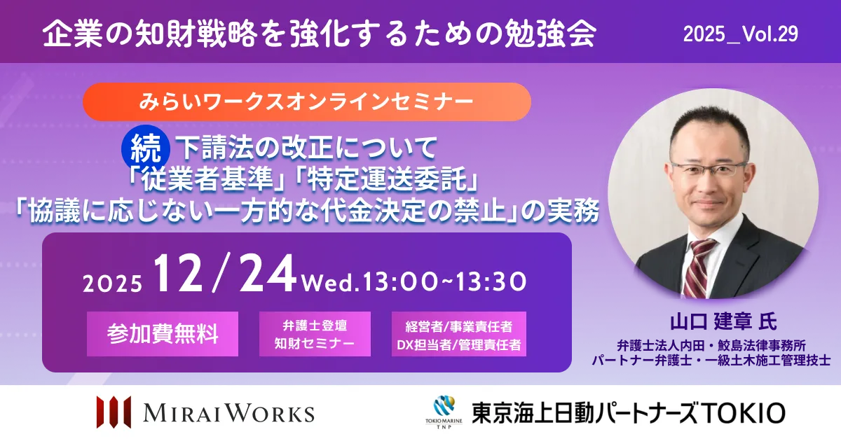 続・下請法の改正についてのオンラインセミナーが、2025年12月24日(水)に開催されます。主催は、株式会社みらいワークス、株式会社東京海上日動パートナーズTOKIO、弁護士法人内田・鮫島法律事務所の三社の共催です。このセミナーは、今年5月に成立した下請法の改正を受け、実務上の具体的な対応についてくわしく探ります。