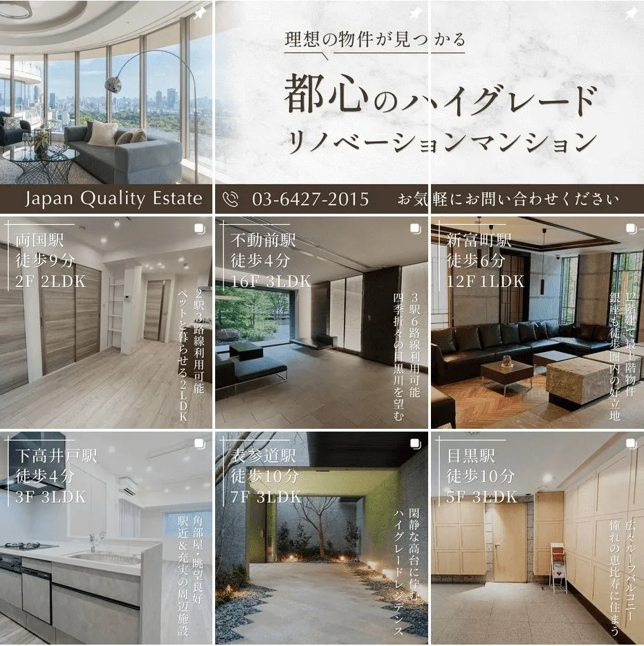 近年、物件探しの手法が変わりつつあり、「SNSで情報を得てからWEBサイトを訪問する」ユーザーが増加しています。特に高級物件の場合、SNSが最初の接点となることが多くなっています。例えば、日本クオリティエステートでは、インスタグラムを活用して販売価格7億円のハイグレード物件に対する問い合わせを獲得しました。