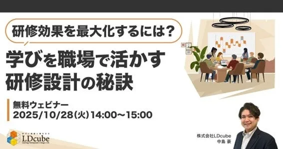 株式会社LDcubeが、2023年から継続的に行っている人材育成施策の調査結果をもとに、研修を実施しても社員の行動が変わらないという課題に挑むウェビナー「研修効果を最大化するには?学びを職場で活かす研修設計の秘訣」を開催します。今回のウェビナーは、10月28日14:00から15:00まで、オンラインで行われます。参加費用は無料で、多くの企業の人事担当者や研修企画者にとって有益な内容となるよう設計されています。