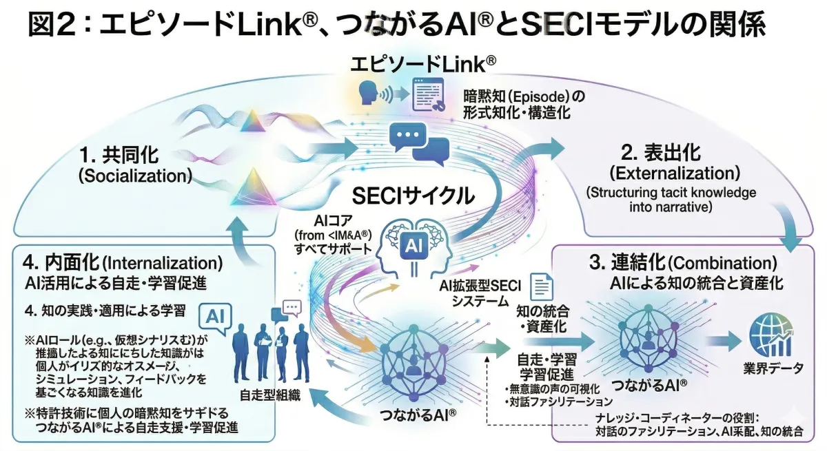 近年、企業は効率化だけでなく、新しい価値の創出が求められています。そこで、株式会社日本コミュニケーションアカデミー(COMAC)と株式会社TSUMUGUが共同で開発したのが「AI拡張型SECIモデル」です。このモデルは、野中郁次郎著の知識創造理論「SECIモデル」の概念をAI技術で拡張し、組織の“暗黙知”を効果的に資産化することを目指しています。