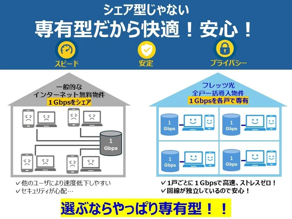 ストレスフリーな利用:特に在宅勤務やオンライン授業を受ける際には、回線の安定性が求められます。専有型インターネットは、これらのニーズに応える形で快適な利用環境を提供します。