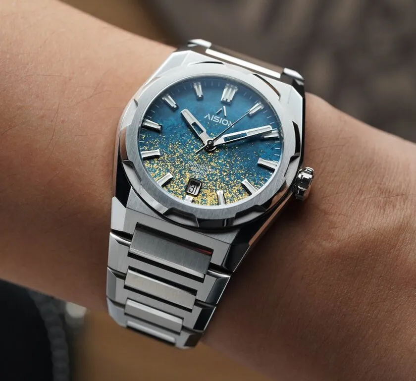 時計のケースは、AISIONによってデザインされており、歯車をイメージさせるアイコニックな形状が特徴です。一般的な腕時計とは異なり、多くの面を持ち、光を巧みに反射することで美しい煌めきを生み出しています。職人の手によって丁寧に研磨されたこのケースは、一つ一つが特別な存在です。