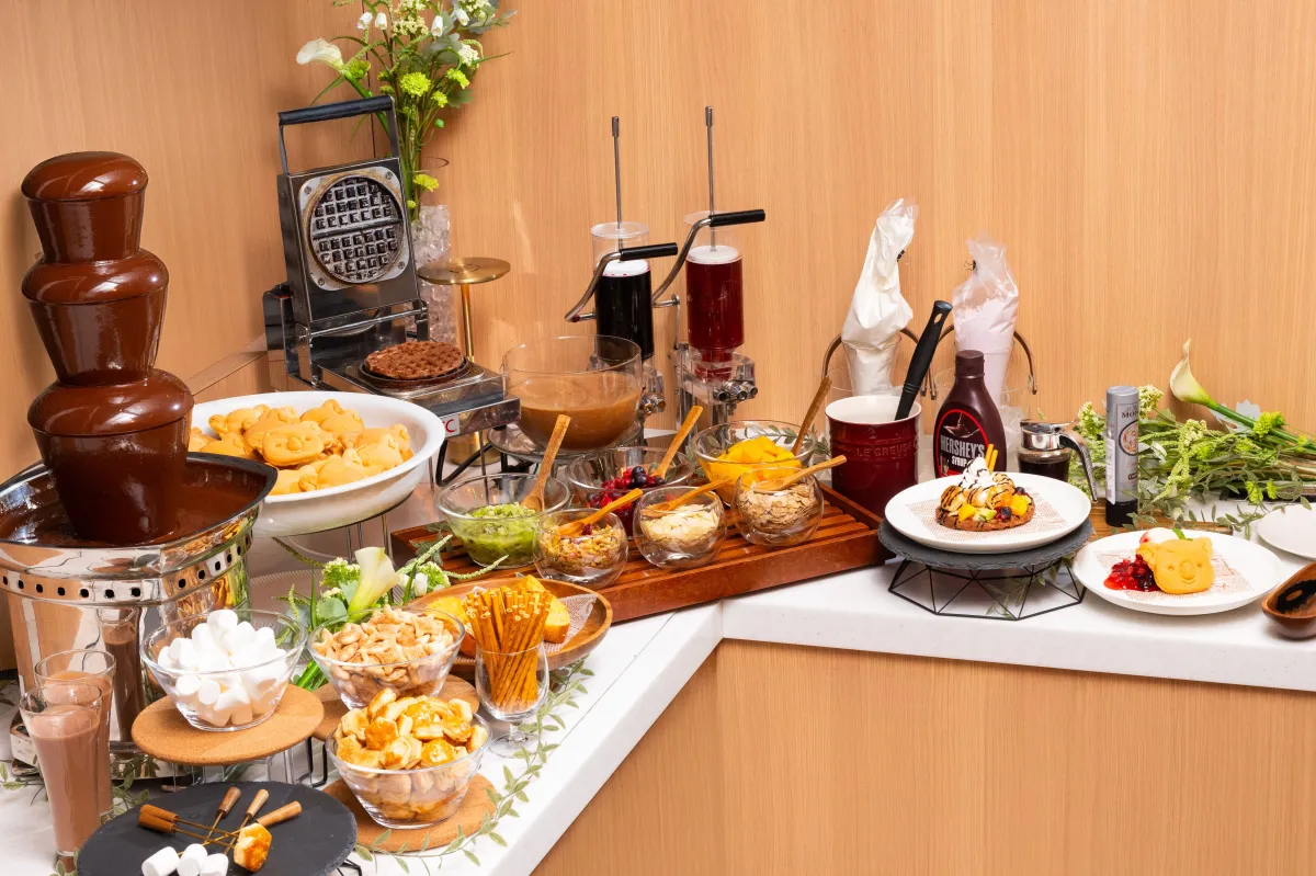 「シャルロッテ」というレストランで楽しめるこの朝食ビュッフェは、地元の食材をふんだんに取り入れた和洋折衷のビュッフェスタイルで、健康美を意識しています。例えば、ガーナチョコレートを使用したチョコレートファウンテンや、そのチョコレートドリンクは大変好評です。また、コアラのマーチを使った特殊なパンケーキも、見た目が可愛らしく、SNS映えすること間違いなしです。