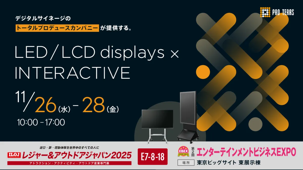 株式会社プロテラスは、2025年11月26日から28日まで、東京ビッグサイトの東展示棟で開催される「レジャー&アウトドアジャパン2025」および「第2回エンターテインメントビジネスEXPO」において、革新的なデジタルサイネージソリューションを展示します。
