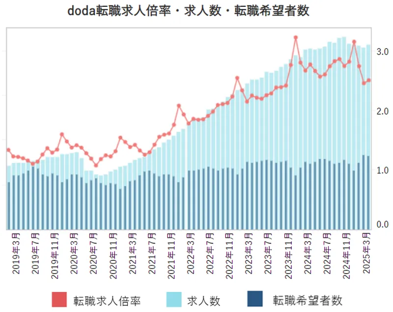 パーソルキャリア株式会社が運営する転職サービス「doda」は、2025年3月の転職求人倍率を最新のデータとして発表しました。この情報は、現在の中途採用市場における需給バランスを示しており、2025年3月の求人倍率は2.51倍で、前月比で0.05ポイントの上昇を見せました。これは、転職活動を希望する求職者に対して、求人数がどの程度あるのかを示す重要な指標です。