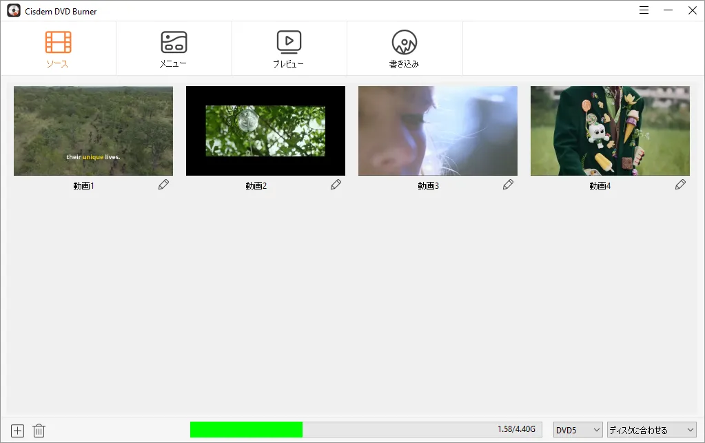 DVD Burnerは、MP4やMOV、VOB、MTSなど、100種類以上の動画形式をサポートしており、複数のフォーマットの動画をDVDディスク、DVDフォルダ、ISOファイルに書き込むことが可能です。これにより、YouTubeやFacebookなどからダウンロードしたコンテンツも手軽にDVD化できます。