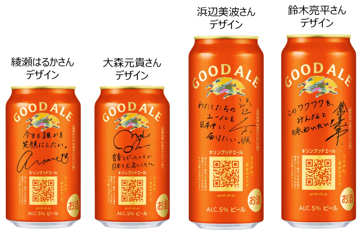 このメッセージ缶には、実際に日本のコミュニティを元気づける活動「グッドエールJAPAN」に賛同したブランドリーダーたち、綾瀬はるかさんやMrs. GREEN APPLEの大森元貴さん、浜辺美波さん、そして鈴木亮平さんが手書きでメッセージを寄せました。缶裏面にそれぞれのメッセージとサインが入っており、350ml缶には綾瀬はるかさんと大森元貴さん、500ml缶には浜辺美波さんと鈴木亮平さんのメッセージがデザインされています。