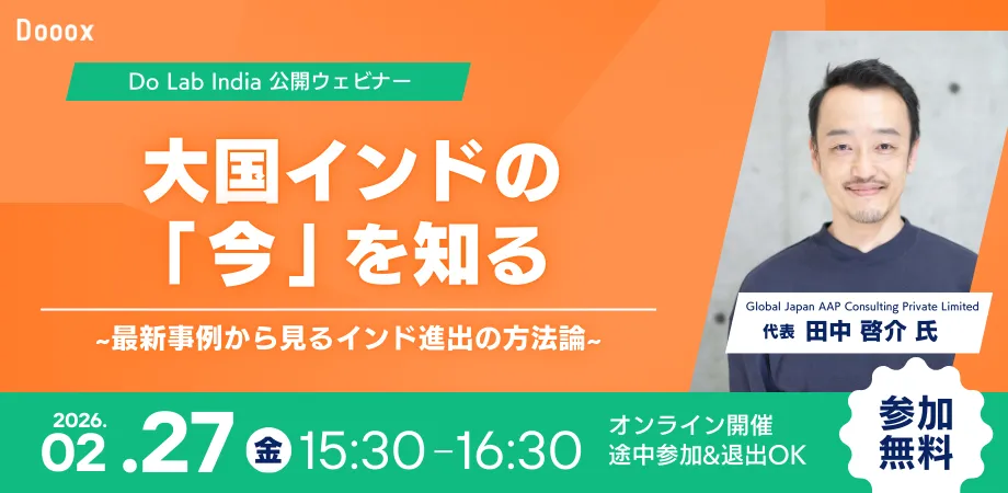 株式会社Doooxが運営するインド進出支援プラットフォーム「Do Lab India」は、2026年2月27日(金)に「大国インドの『今』を知る - 最新事例から見るインド進出の方法論 -」というウェビナーを開催します。この無料オンラインイベントでは、日本企業がインド市場へ進出する際に知っておくべき情報が提供されます。