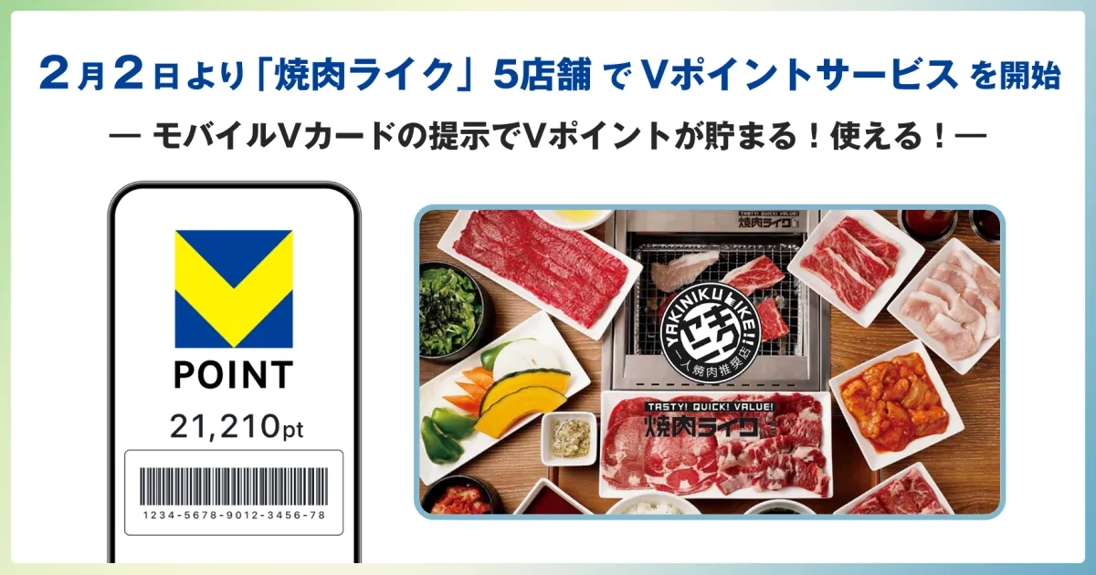 2026年2月2日(月)、焼肉専門店「焼肉ライク」は、5つの店舗でモバイルVカードを使ったVポイントサービスを導入することを発表しました。このサービスにより、来店客は簡単にポイントを貯めて利用できるようになります。