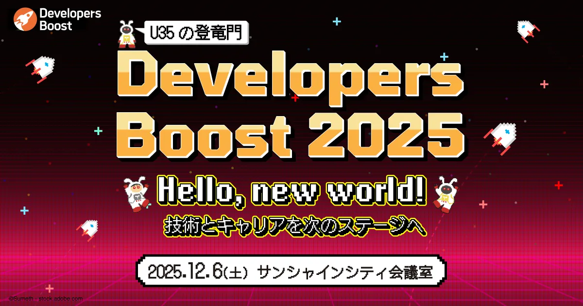 「Developers Boost 2025」の開催日時は2025年12月6日、会場はサンシャインシティ会議室内のワールドインポートマートビル5Fです。参加は35歳以下のITエンジニア及びITエンジニアを目指す学生を対象とし、事前登録をすることで無料で参加可能です。公式サイトでの登録が求められます。