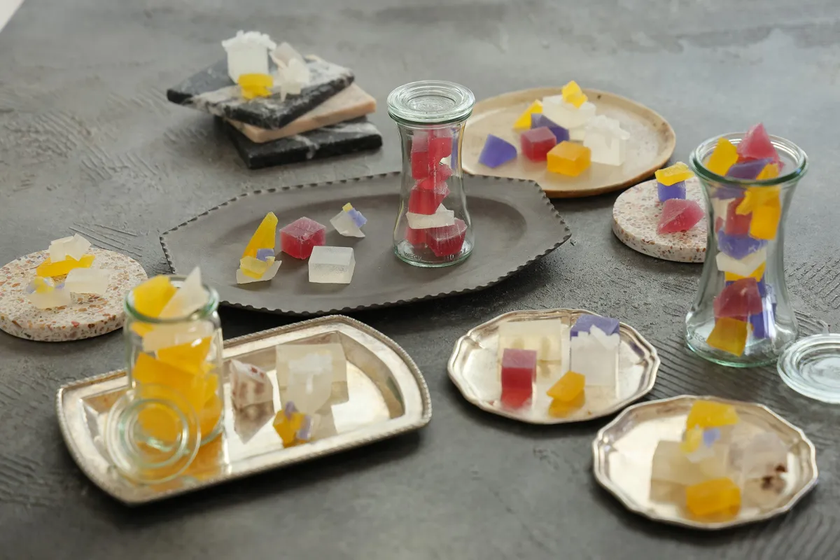 この琥珀糖は、WECKのキャニスターに入れることで、見た目にも美しく、食べる楽しみも増します。また、ラッピングを施してプレゼントすれば、喜ばれること間違いなしです!