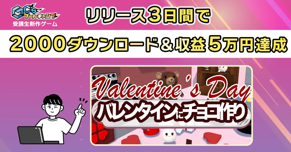 オンラインゲームスクール『GC’sブートキャンプ』の受講生であるTiraGameさんが、わずか2ヶ月で開発したスマホ向け脱出ゲーム「脱出ゲーム バレンタインにチョコ作り」が、リリース3日間で2000ダウンロード、5万円の収益を達成しました。この快挙は、ゲーム開発未経験者にとって大きな励みとなるでしょう。
