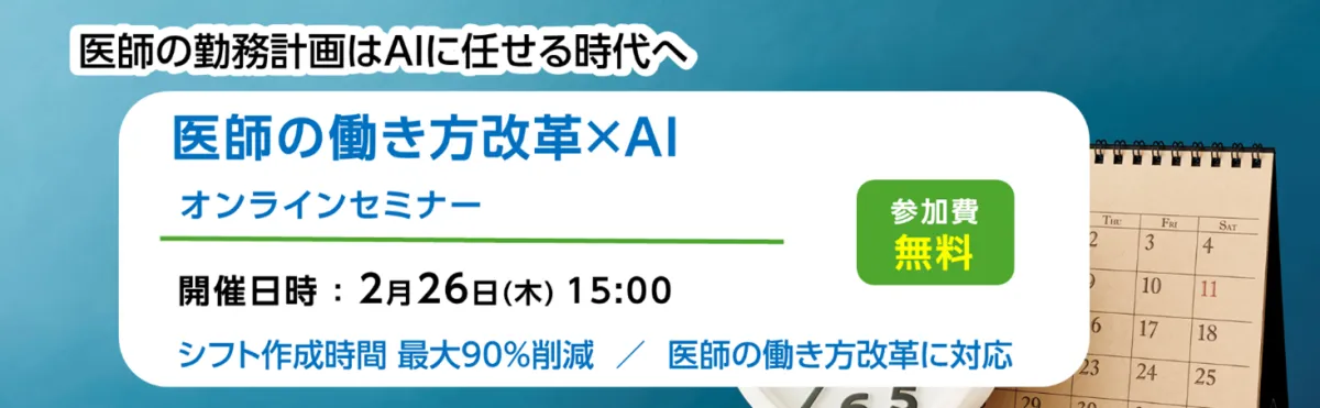 株式会社ニーズウェルが主催する無料オンラインセミナー『医師の働き方改革×AI』が、2026年2月26日(木)15時に開催されます。医療機関における医師の勤務計画は、外来や当直、研究日、派遣調整など、多くの要素が絡まり合い、複雑な業務プロセスとなっています。加えて、各医師の希望や公平性に配慮した調整も必要となるため、従来の方法では時間がかかることが多く、月に数十時間を要することも少なくありません。