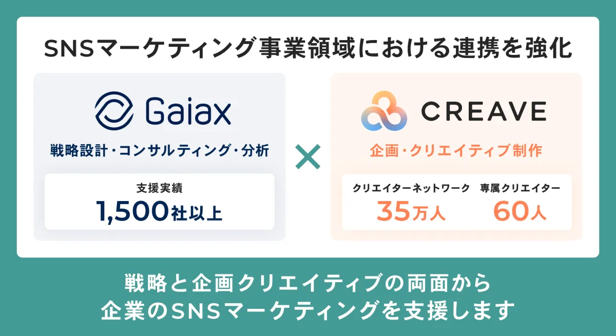 株式会社CREAVE(クリエイティブマーケティング企業)は、親会社である株式会社ガイアックスとのSNSマーケティング事業における連携を一層強化しました。この合意により、両社は共同で企業のマーケティング課題に取り組む体制を構築し、SNSを活用した支援を強化することを目的としています。