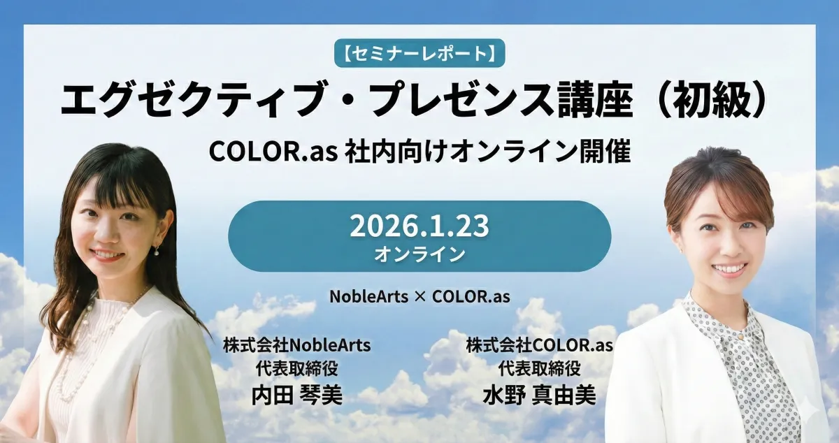 2026年1月23日、株式会社Noble Artsの代表取締役社長である内田琴美が、株式会社COLOR.as主催の社内向けセミナーに登壇し、「エグゼクティブ・プレゼンス講座(初級)」を実施しました。この講座は、経営者や役員、士業などの大切な意思決定者との効果的なコミュニケーションを促進するためにデザインされています。