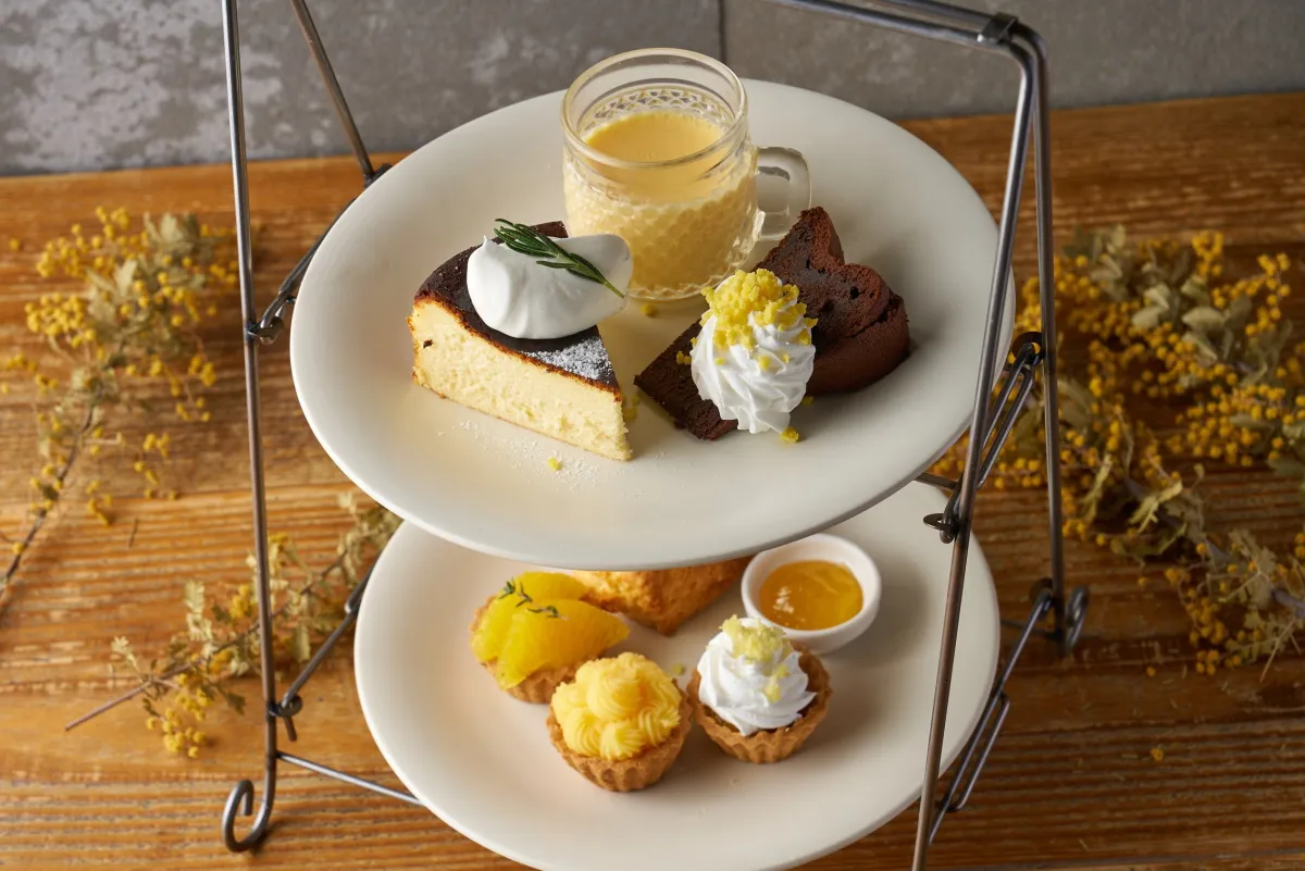 特製のミモザPDSは、藤井美佐さんが生産した平地平飼い卵を使用したプリンや檸檬とローズマリーのバスクチーズケーキ、ミモザガトーショコラなどが盛り込まれています。これに加え、檸檬のスコーンやミニタルトも楽しめます。季節感溢れる“ミモザイエロー”を基調に、新鮮な柑橘の香りが広がるメニューをぜひご堪能ください。