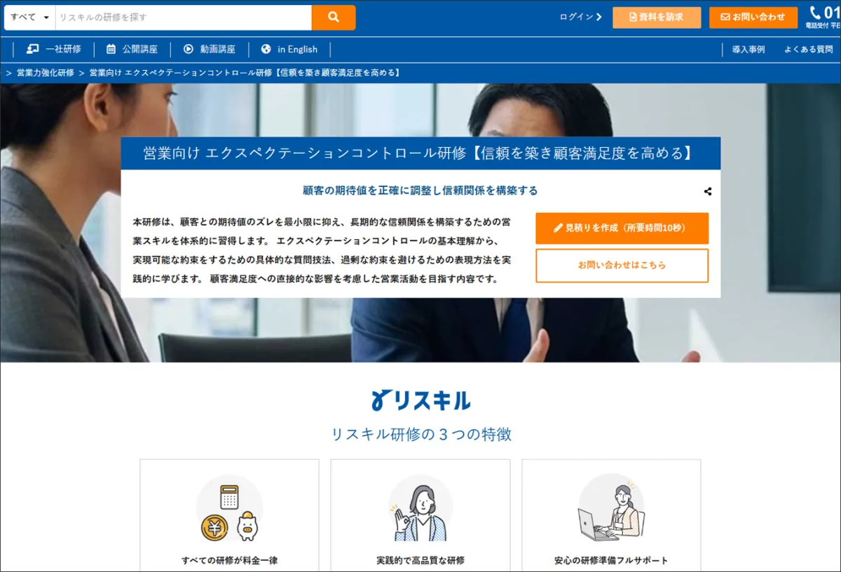 株式会社リスキルは、法人向けの研修事業を展開する企業です。当社は、顧客との信頼関係を構築し、顧客満足度を高めるための具体的な方法を提供し、さまざまな業界で高い評価を受けています。本研修を通じて、営業担当者は必要なスキルを習得し、企業の売上向上に貢献できることが期待されます。今後も株式会社リスキルは、さらなる研修プログラムの開発を通じて、営業の現場を支援し続けていきます。