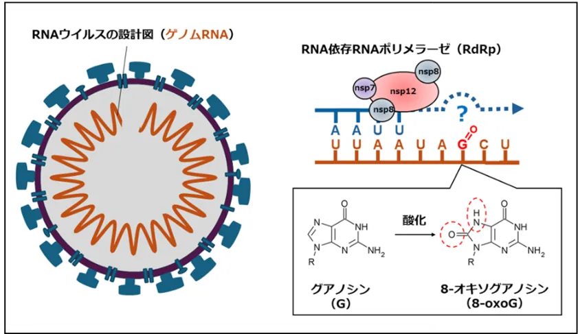 本研究では、ROSによるRNA損傷、特にグアノシン(G)の酸化によって生じる8-オキソグアノシン(8-oxoG)がウイルスRNAの複製に与える影響を詳細に調べました。これは世界で初めて、SARS-CoV-2のRNA複製における酸化ストレスのメカニズムを解明したものです。具体的には、RNA依存RNAポリメラーゼ(RdRp)がRNA合成の過程でどのように8-oxoGの影響を受け、変異が生じるのかを実験的に示しました。