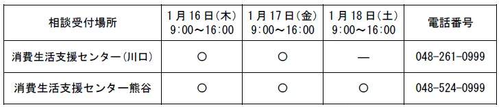 この特別電話相談は、1月16日、17日、18日の3日間、消費者ホットライン【全国共通】188(いやや)を通じて受け付けます。さいたま市でも同様のキャンペーンが実施されており、消費生活相談窓口を設けています。以下はさいたま市の相談窓口です: