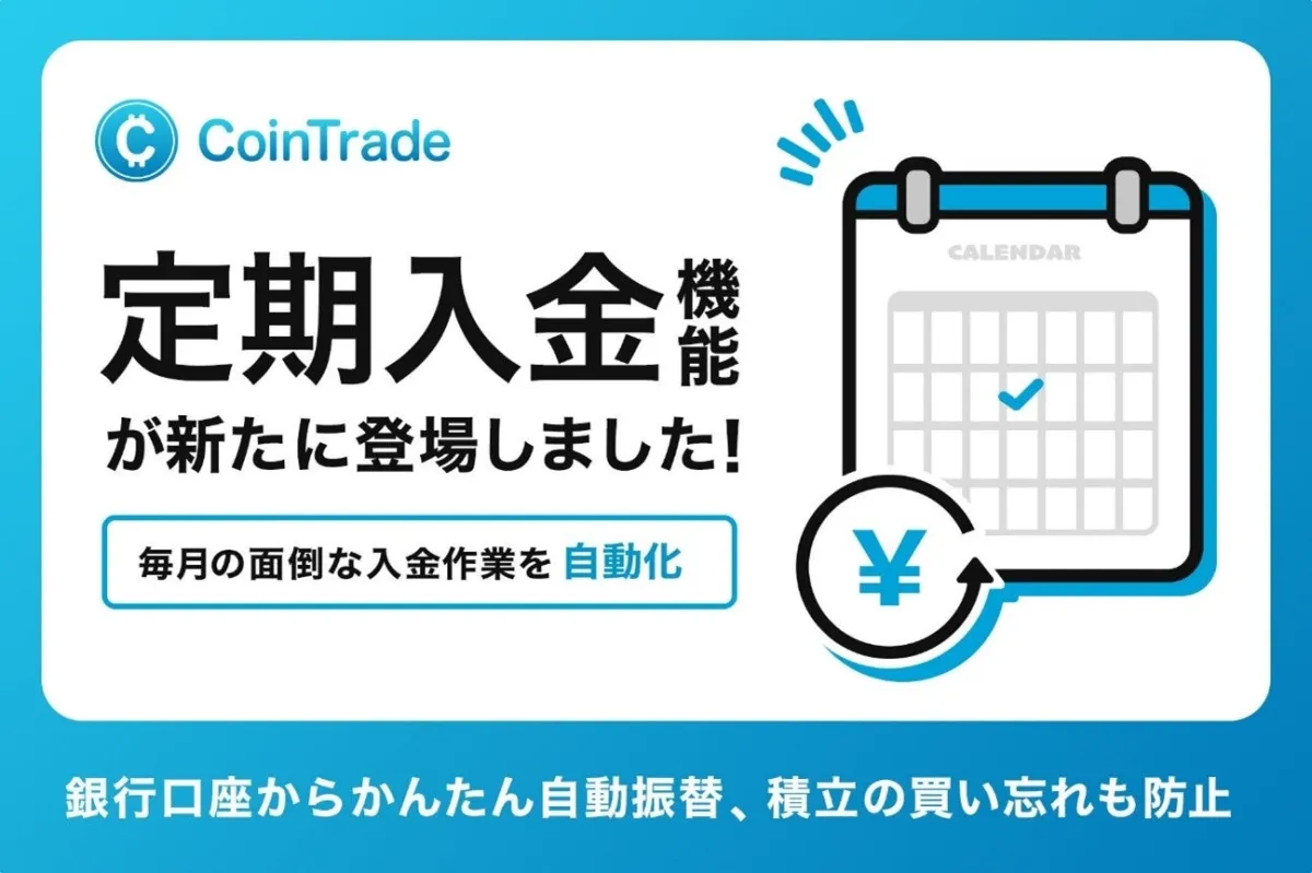 CoinTradeは、暗号資産販売所として2021年3月にスタートしました。ユーザーが手軽に暗号資産の売買を行えるよう、シンプルなインターフェースを提供しています。今回の定期入金機能が追加されることで、利用者は毎月定めた額を自動でCoinTradeの口座に振り込むことができ、手間を省けるようになります。これにより、従来の手動での入金作業から解放され、よりスムーズに取引を進められるようになります。