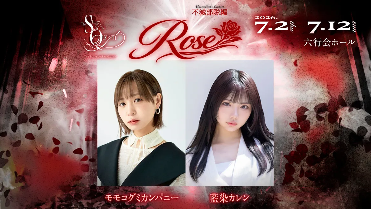 演劇シーンに新たなる風を吹き込む「女王ステ」シリーズ。その最新作「女王ステ 不滅部隊編『Rose』」のキャスト情報が解禁され、元BiSHのモモコグミカンパニーとZOCの藍染カレンがダブル主演を務めることが決定した。