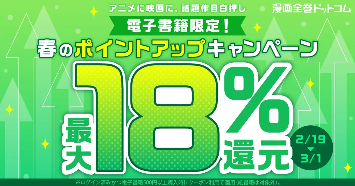 漫画全巻ドットコムでは、お得な春のポイントアップキャンペーンが開催されています。このキャンペーンは電子書籍に特化しており、期間限定の特別クーポンを利用することで、合計500円以上のお買い物に対して最大18%のポイント還元が受けられます。