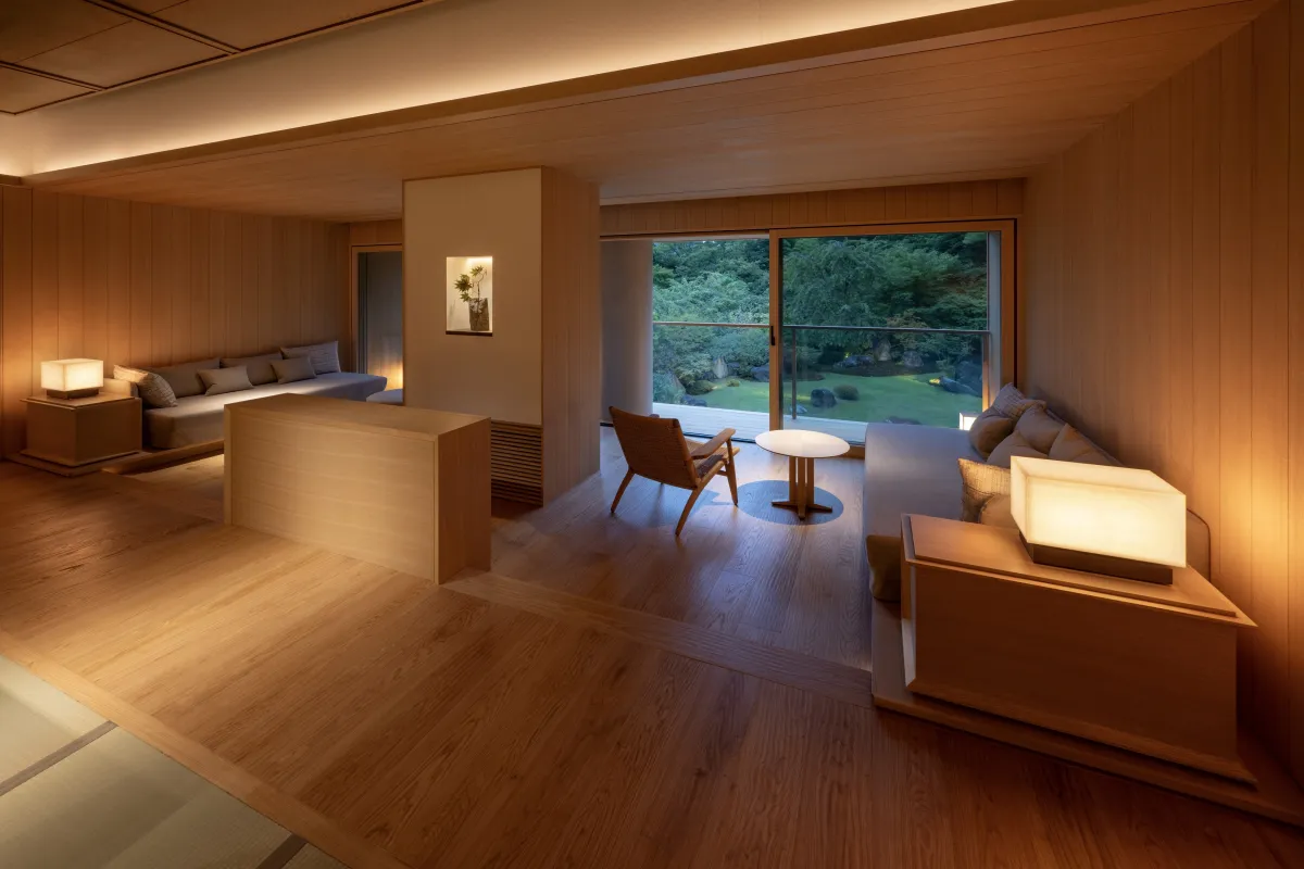 「東雲」という名前は、夜明け前の柔らかな光が空に広がる瞬間を指しており、この時間に見られる幻想的な邸の景観を全面的に楽しむことができます。客室からは、時刻や季節によって異なる表情を見せる枯山水式の石庭を眺めることができ、客人はその美しさに包まれながら、心に残る時間を過ごせます。