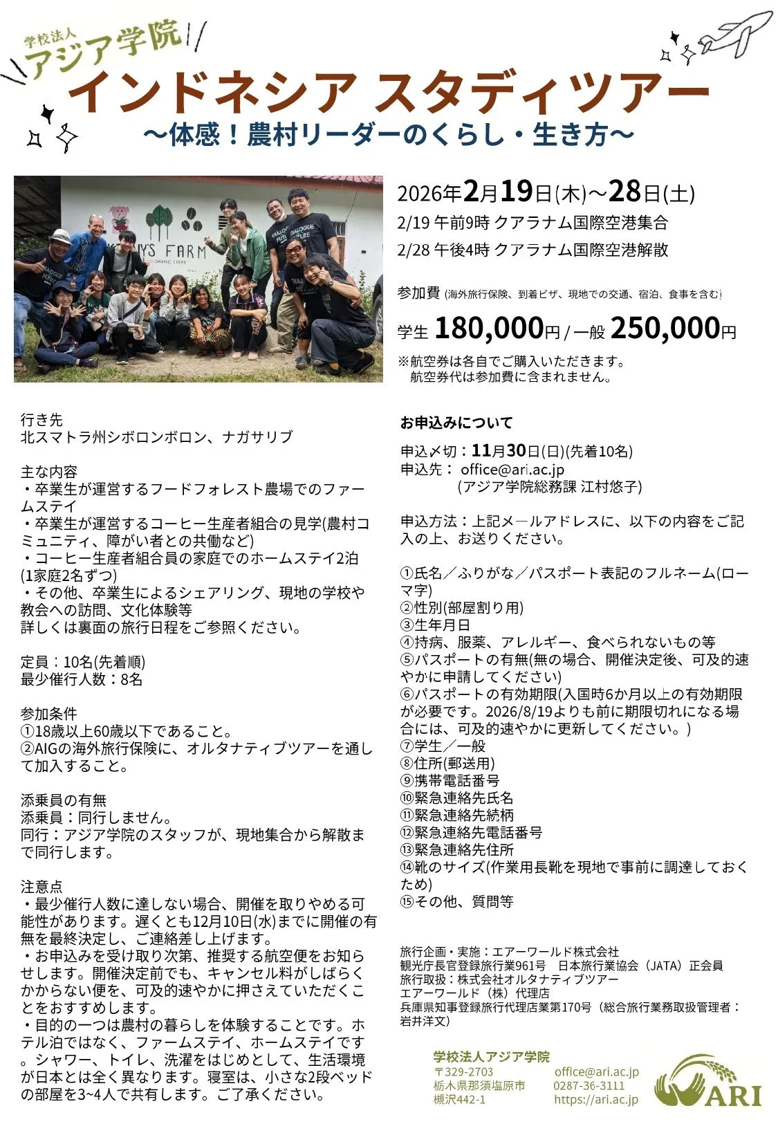 旅行の実施はエアーワールド株式会社が担当しており、アジア学院のスタッフが現地でサポートしてくれます。より多くの方々の参加をお待ちしています。