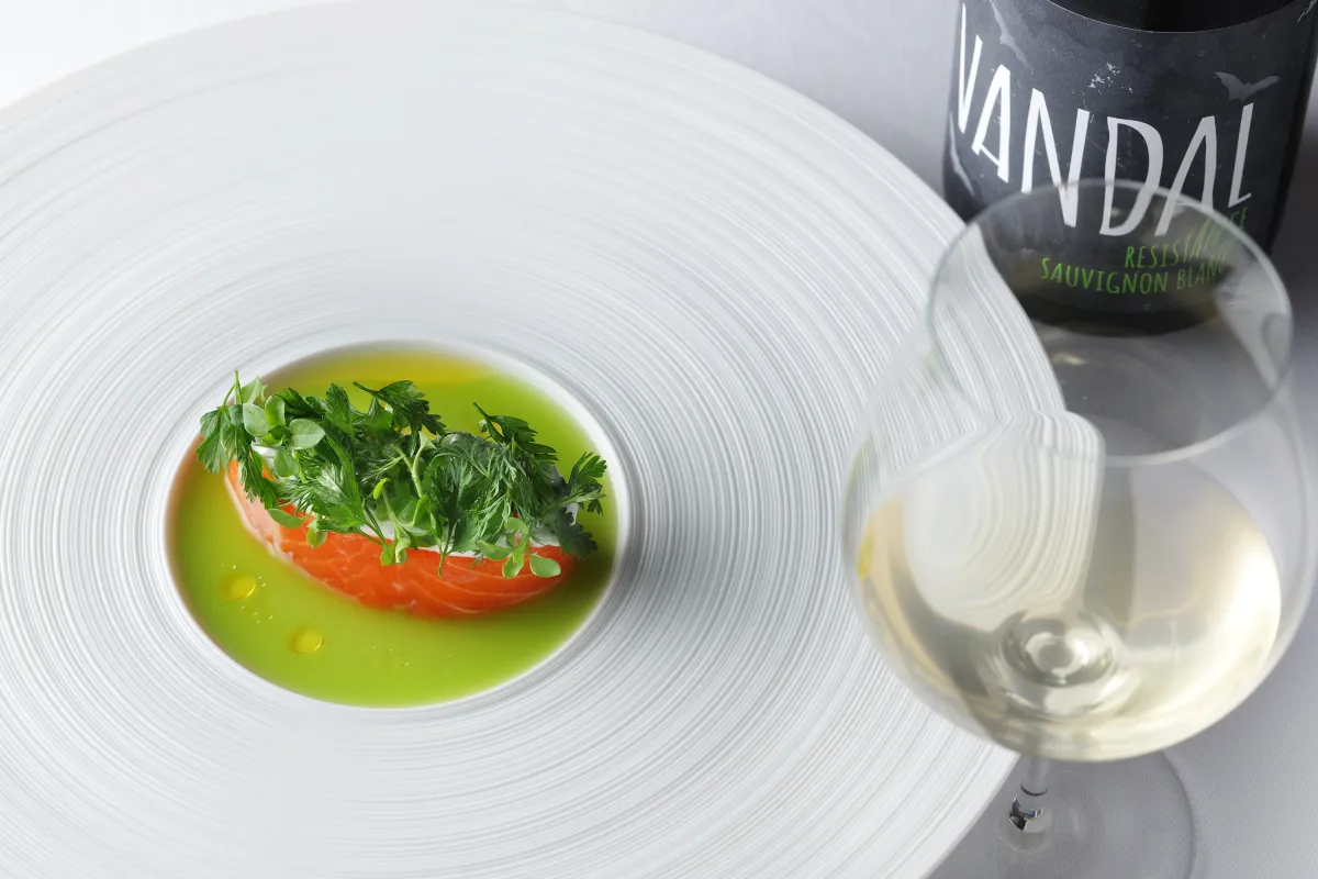 「Sonore」では、地元の食材をふんだんに活かした春限定コースを展開しており、その代表的な料理には、次のようなメニューがあります。まずは冷前菜の「サーモン」。新鮮なサーモンと旬のエンドウ豆を組み合わせたこの一皿は、熟成サーモンのまろやかな旨みと、わさびを効かせたヨーグルトソースが絶妙に響き合います。特に、豆の食感やハーブの香りがアクセントとなり、次々に食べ進める楽しみを与えてくれます。