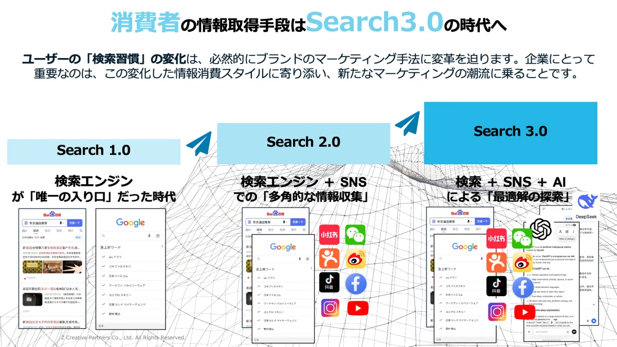 - - Search 3.0: AIとSNS、検索エンジンを統合し、消費者がAIによるリコメンドを基に購買決定を行う時代。