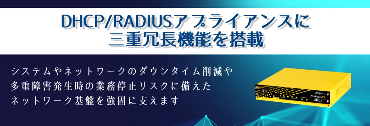 インフィニコは、最近のビジネスニーズの変化に応え、新たにDHCP/RADIUSアプライアンスに「三重冗長機能」を追加することを発表しました。この機能により、システムの安定性が向上し、思いがけないトラブルが発生した場合でも業務が不中断となります。