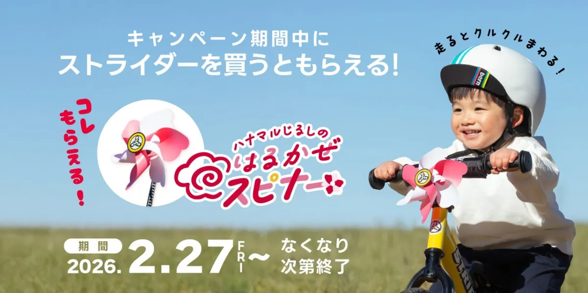 キャンペーン期間中にストライダーをご購入の方には、「ハナマルじるしのはるかぜスピナー」がプレゼントされます。このスピナーは、走ることで風を受け、クルクルと回転します。走る楽しさをより感じられるアイテムとなっており、全てのストライダーに装着可能です。春のメモリアルアイテムとしての役割も果たします。