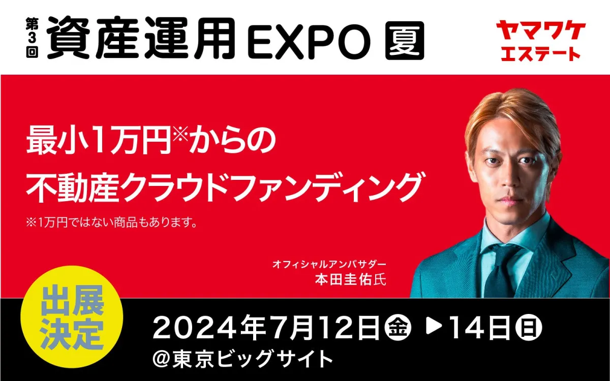 不動産クラウドファンディングを提供するヤマワケエステート株式会社が、2024年7月12日(金)から14日(日)まで東京ビッグサイトで開催される「第3回 資産運用EXPO【夏】」に出展します。