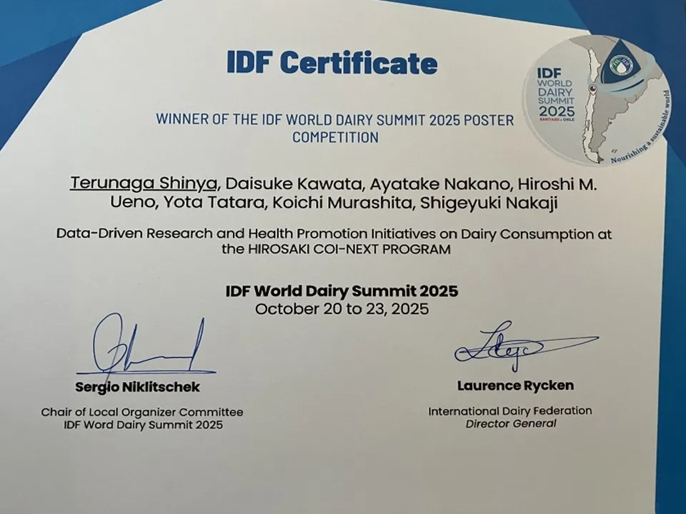 2025年10月、チリのサンティアゴで開催された「IDFワールドデーリーサミット2025」において、雪印メグミルク株式会社が弘前大学との共同研究によるポスター発表で栄誉ある「最優秀ポスター賞」を獲得しました。この受賞は、乳製品摂取がもたらす健康上の利点に関する研究成果が評価されたものです。