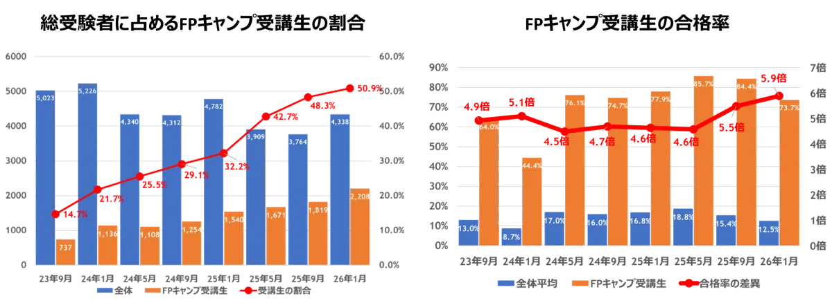 株式会社スクエアワークスが運営するオンラインFP資格スクール「FPキャンプ」は、2026年1月に実施されたFP1級学科試験で、受講生が全体の51%を占め、初めて過半数を突破しました。全体の受検者数4,338人中、FPキャンプ受講生は約50.9%を占め、受講生の合格率は74%にも達したのです。この合格率は、全体平均12.5%の約5.9倍という驚異的な数字で、FPキャンプの提供する教育の質を証明しています。