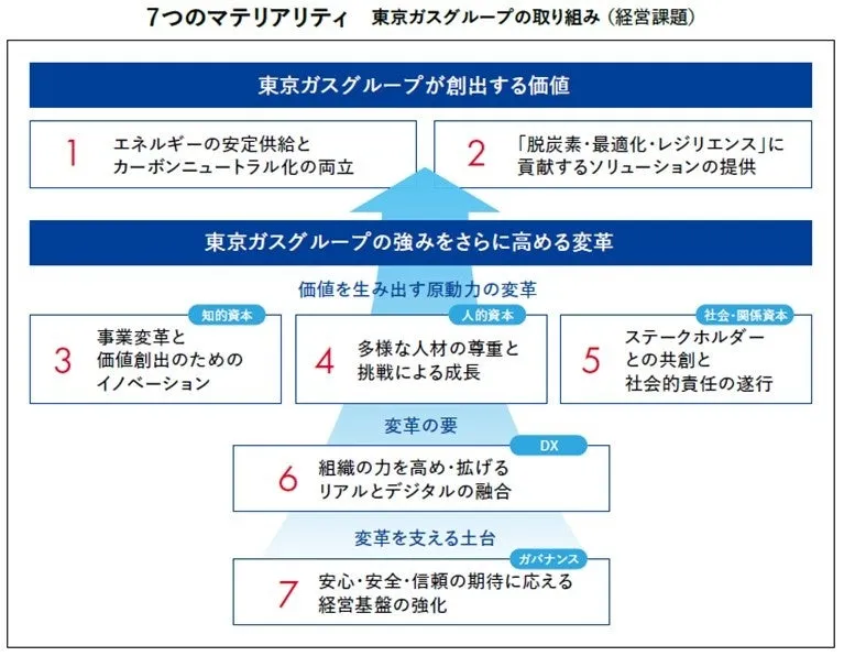 東京ガス株式会社は、経営理念と戦略を一体化させるために、7つの新たなマテリアリティを策定しました。この新たな取り組みは、東京ガスグループが「人によりそい、社会をささえ、未来をつむぐエネルギーになる。」というビジョンを実現するための核心となります。