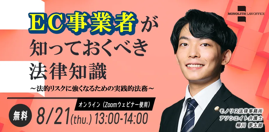 2023年8月21日(木)に予定されている、EC事業者向けのオンライン法務セミナーについてお知らせします。弁護士法人モノリス法律事務所が主催となり、インターネットビジネスに注力する方々にとって、重要な法的知識を提供します。