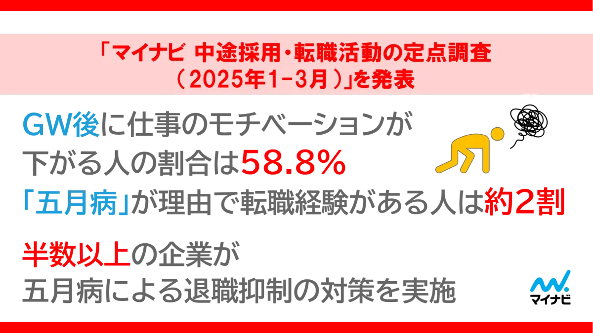 以上のように、2025年の中途採用・転職活動に関する調査結果は、転職市場の現状や、五月病の影響が浮き彫りになる内容でした。企業は今後も従業員のメンタルヘルスに目を向け、定期的なコミュニケーションを行うことで、円滑な職場環境を維持することが求められます。