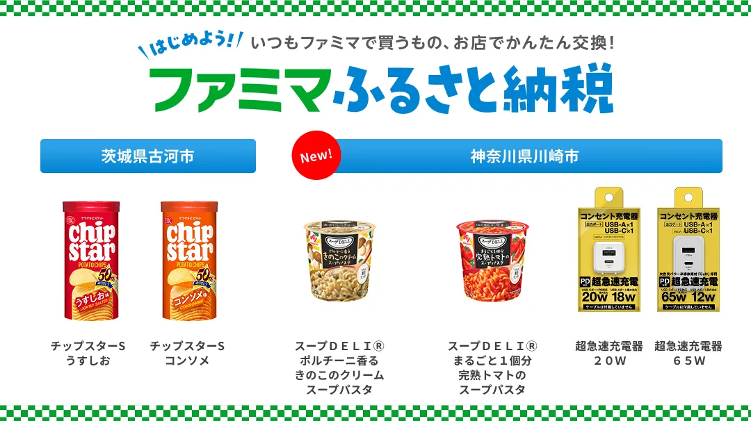 | 茨城県古河市 | チップスターSうすしお/コンソメ | 3,000円、5,000円、8,000円 | 4個、7個、12個 |
