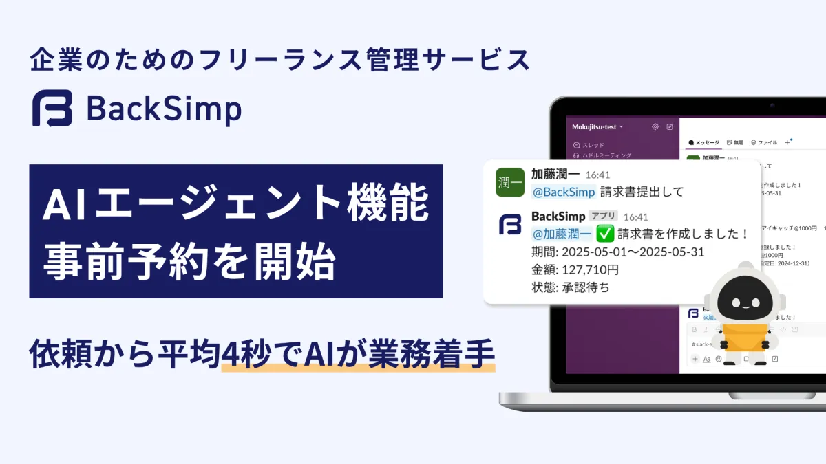 株式会社モクジツの提供するフリーランス管理サービス「BackSimp」が、Slack上で業務を効率よく管理できる新機能「BackSimp Agent(バックシンプ・エージェント)」の事前予約を2025年7月30日より開始しました。この新機能はすべてのプランの利用者に対応しており、追加料金の心配もありません。
