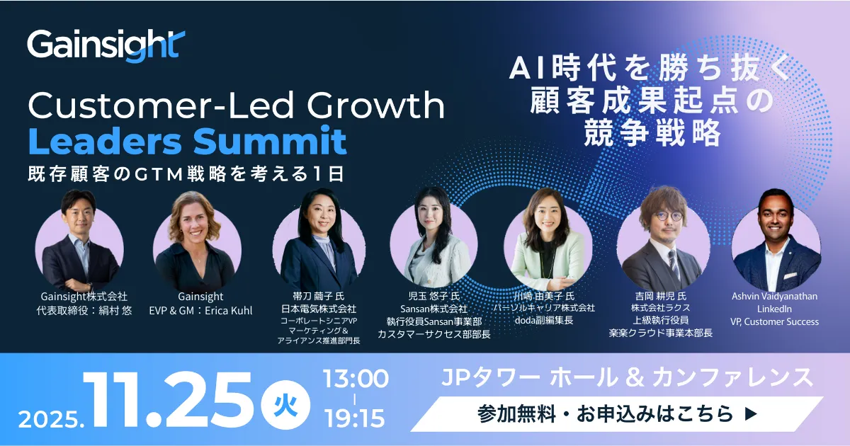 2025年11月25日、Gainsight(ゲインサイト)は、日本で初めてのCustomer-Led Growth Leaders Summitを開催します。このイベントは、顧客主導の成長戦略をテーマにしており、13時から19時15分までの間、JPタワー ホール&カンファレンスで行われる予定です。