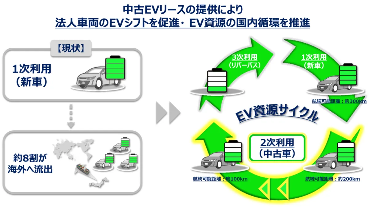近年、カーボンニュートラルの推進に伴い、企業におけるEVへのシフトが加速しています。しかし、新車のEVは選択肢が限られており、リース料金も高いため、導入を諦める企業が少なくありません。また、中古EVは航続距離の減少やバッテリー劣化に対する不安から敬遠されることも多いのが現状です。特に、5年から7年の年数を経た中古EVの74%は国外に輸出されてしまい、国内の貴重な資源の循環に影響を与えています。