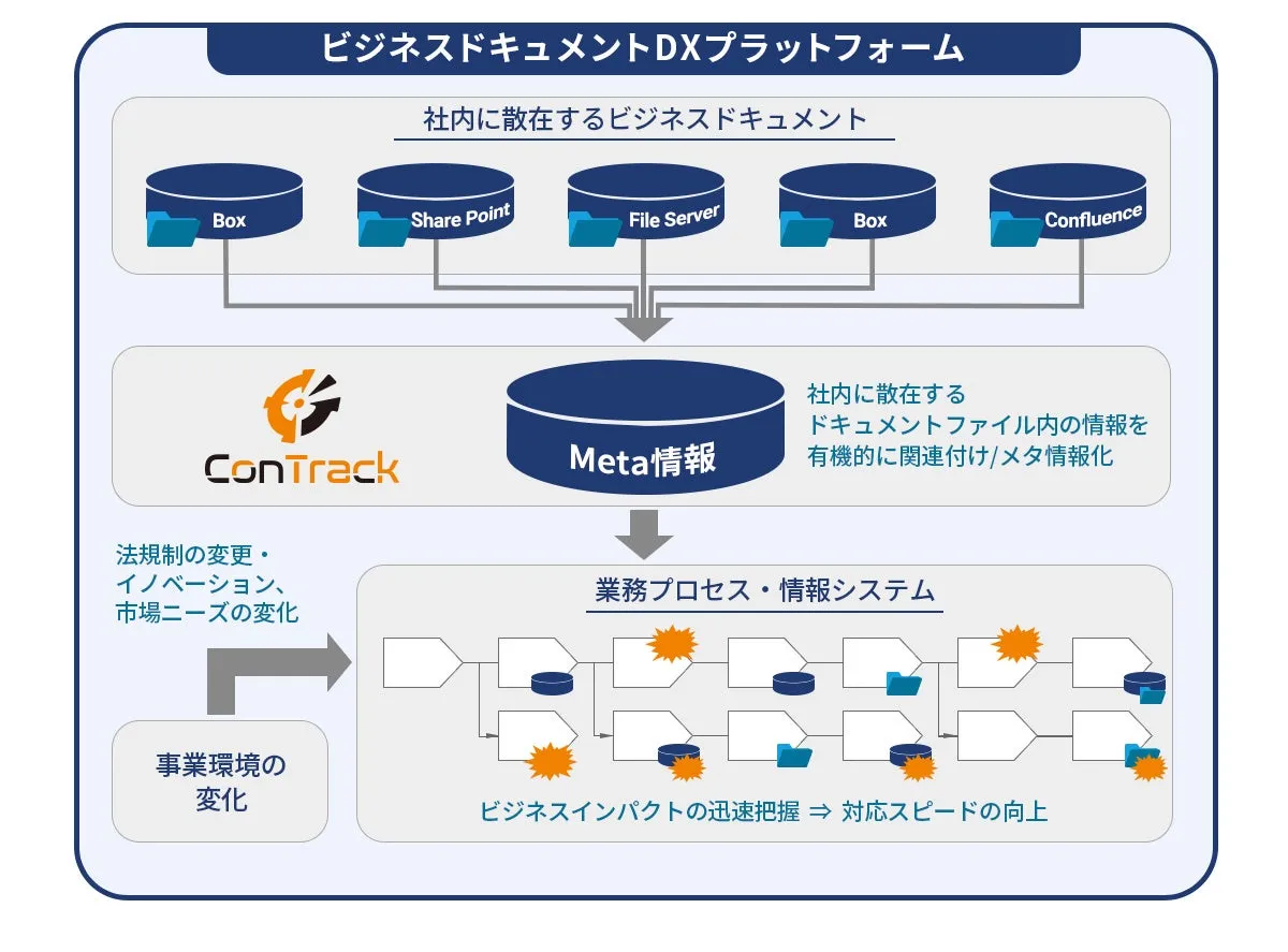 これまで『ConTrack』は、主にシステム開発のドキュメント管理に重点を置いてきましたが、今後は企業内の様々なビジネスドキュメントを統合的に活用するプラットフォームへと進化させる計画があります。法律文書や契約書、社内規程など、複雑なドキュメントをメタデータ化し、一元管理することにより、迅速で正確な情報アクセスが実現可能になります。