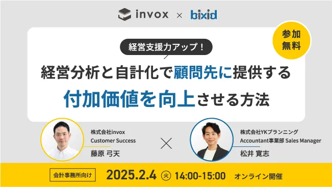 2025年2月4日(火)14:00より、オンラインで特別セミナー『経営分析と自計化で顧問先に提供する付加価値を向上させる方法』が開催されます。主催は、経営判断支援のクラウド『bixid(ビサイド)』を提供する株式会社YKプランニングと、顧客成功を目指す株式会社invoxです。
