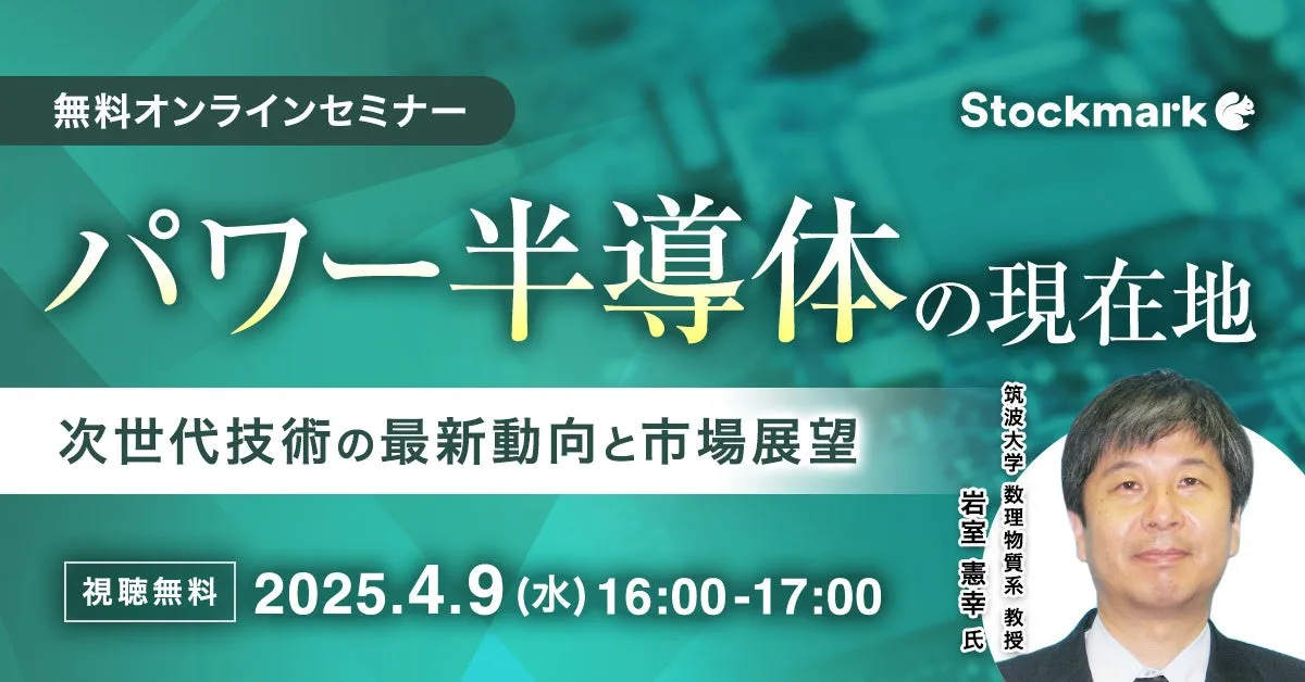 近年、電力需要の急増が懸念される中、特に注目されているのがパワー半導体の技術革新です。ストックマーク株式会社は、4月9日(水)にオンラインセミナー『パワー半導体の現在地 - 次世代技術の最新動向と市場展望』を開催します。このイベントでは、筑波大学の岩室憲幸教授をお招きして、最新技術と市場の動向について深く掘り下げます。