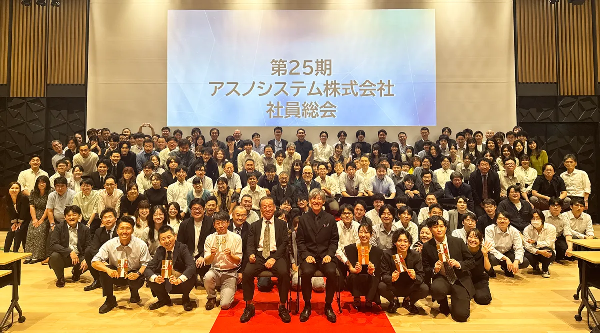 2025年9月6日、アスノシステム株式会社は東京都港区のTODA HALL & CONFERENCE TOKYO HALL Aで、第25期社員総会を開催しました。約180人の社員が集まり、今後のビジョンや戦略について共有し、さらなる成長を誓いました。