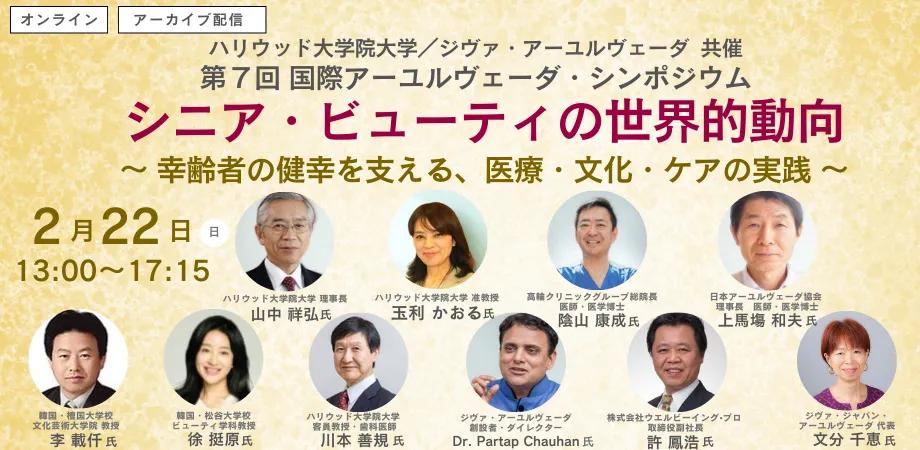 ハリウッド大学院大学とジヴァ・アーユルヴェーダの協力により、2026年2月22日(日)に第7回国際アーユルヴェーダ・シンポジウムが開催されます。このシンポジウムのテーマは「シニア・ビューティの世界的動向」。超高齢社会という日本の現状を反映し、多様な国々でのシニアビューティの動向や健康について深く掘り下げます。