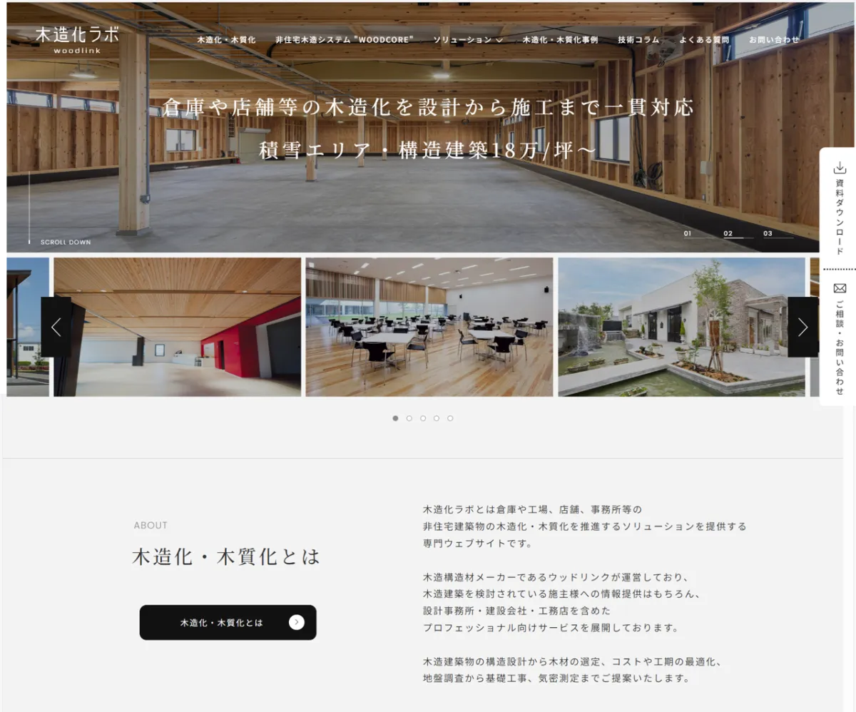 「木造化ラボ」は、非住宅木造建築に関連する情報を集約した専門サイトです。ここでは、「WOODCORE」の詳細情報のほか、木造化や木質化の利点、具体的な事例、よくある質問など、充実したコンテンツを提供しています。この情報は設計事務所やゼネコンだけでなく、戸建て住宅を中心に活動してきた地域の工務店が非住宅市場へのスムーズな参入を図る際にも役立ちます。